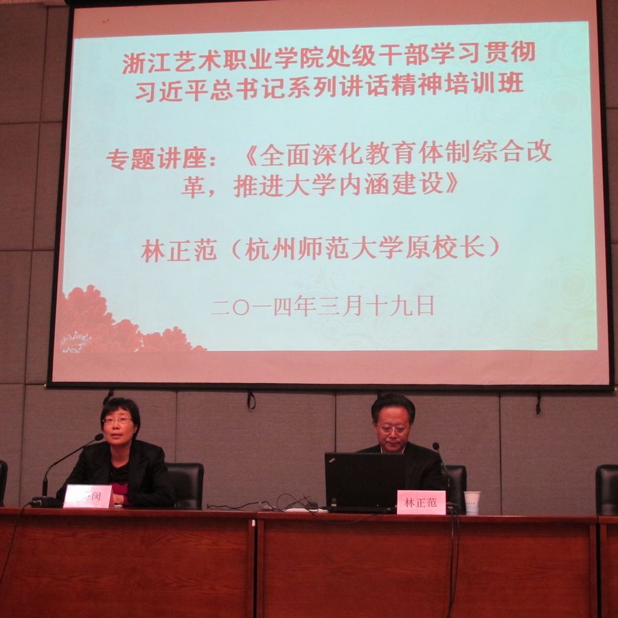 3月19日下午,省高校講師團專家、原杭州師范大學(xué)校長林正范教授應(yīng)邀來浙江藝術(shù)職業(yè)學(xué)院,為處級干部學(xué)習(xí)習(xí)近平總書記系列講話精神培訓(xùn)班作題為《深化改革是促進高等教育發(fā)展與質(zhì)量提升的強大動力》專題講座。學(xué)院黨政班子成員和中層處級干部等聽取講座。
