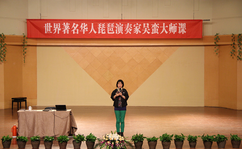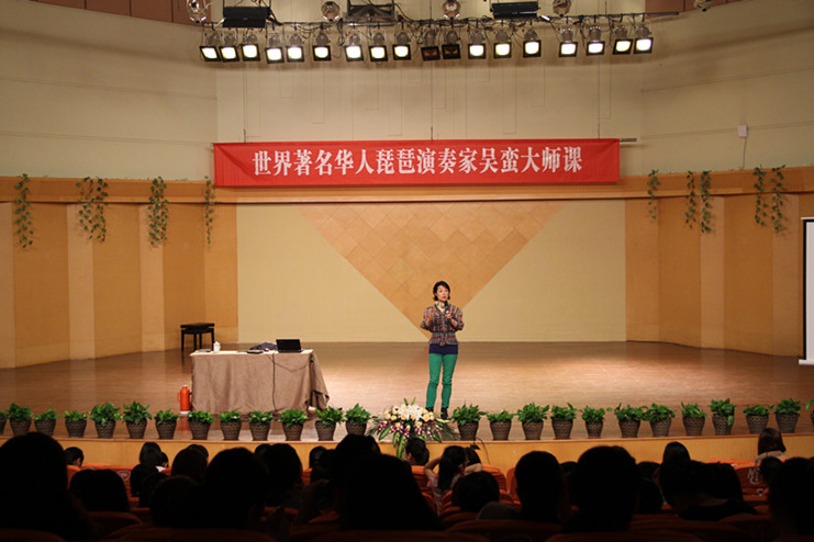 《春江花月夜》、《十面埋伏》、《靜夜思》、《九月?lián)P花飛》、《跳吧!》,從傳統(tǒng)琵琶古曲到新派琵琶音樂,吳蠻用獨特的革新與創(chuàng)舉將琵琶介紹到西方,開拓一條“中西合璧,納古于今”的琵琶之路。課上,她從傳統(tǒng)音樂的自信心、合作演奏的新作品和音樂跨界問題這三方面來闡述民樂人如何以獨特視角看中國傳統(tǒng)音樂在國際中的發(fā)展。帶著琵琶闖蕩天下,沒有信心真得難成大家。90年初,美國沒有人知道中國傳統(tǒng)樂器,也沒有人了解中國傳統(tǒng)音樂,作為單身一人獨闖美國的琵琶演奏家,吳蠻用強大的自信心和扎實的功底,向世界介紹中國的民樂,介紹中國的傳統(tǒng)文化。她認為音樂無國界,傳統(tǒng)音樂比西洋樂更有發(fā)展空間,學生應做好扎實的基本功訓練,認真學習,持之以恒,靜心感悟,這樣定能在音樂道路上有美好的發(fā)展前景。在演奏新作品時,她提醒學生不能遺忘傳統(tǒng)根基,只炫技巧,要了解整部作品的結構、內(nèi)容,把握每一次獨奏、合奏的機會,多與作曲者交流,讓作曲者了解樂器特點,在交流探討中創(chuàng)造出優(yōu)秀的作品。如何將琵琶與世界各類音樂跨界合作,創(chuàng)作出既具中國民族特色,又有時尚氣息的世界音樂,這需要每位演奏家相互配合,取其精華,這樣才能創(chuàng)作出渾然一體、旋律動人、廣為流傳的世界音樂。現(xiàn)場,為配合演講內(nèi)容,吳蠻還播放幾段個人跨界合作的音樂作品。當代音樂不僅僅屬于西方,它屬于全世界,屬于全人類。在演講中,她無時無刻都傳遞著這樣一個信息:傳統(tǒng)即是國際。