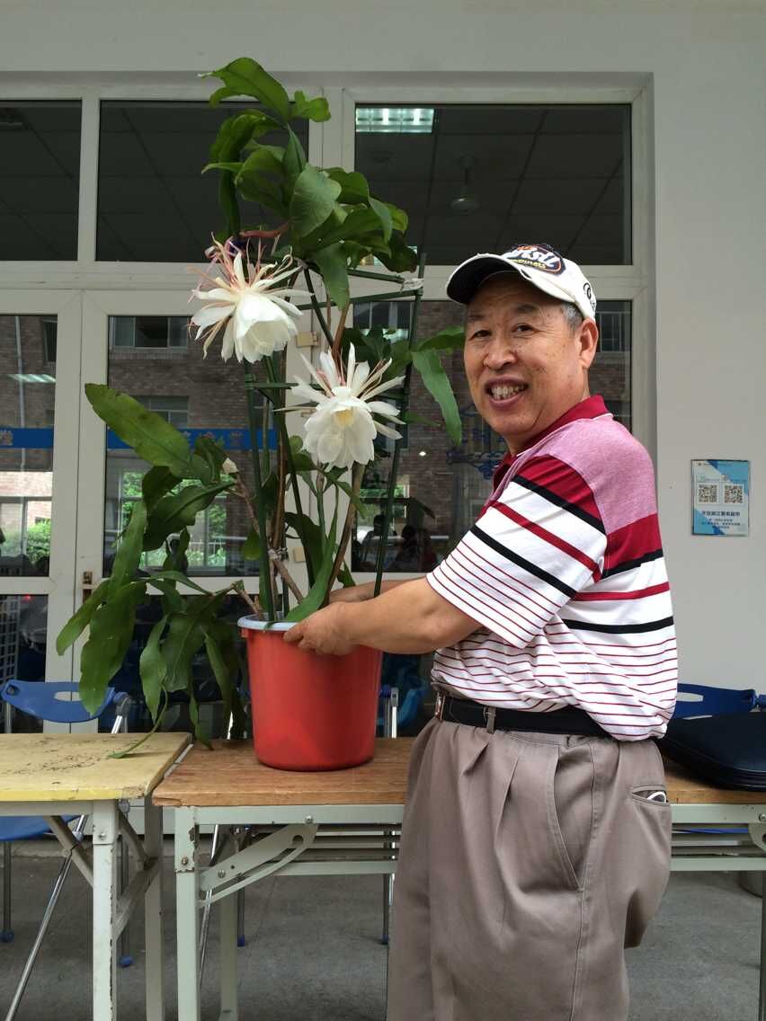 我采訪了徐洪江老師,了解到這盆曇花與他背后的故事。為了這次花展,徐老師在前一天忙活到半夜12點(diǎn)多,凌晨3點(diǎn)多起床準(zhǔn)備花展。由于曇花盆景植株較高,無(wú)法用私家車運(yùn)送至學(xué)校,后來(lái)聯(lián)系上學(xué)校的班車進(jìn)行運(yùn)送。在準(zhǔn)備這次花展的過(guò)程中,徐老師也面臨著家里的一些困難。徐老師的妻子身體不好,需要徐老師照顧。而徐老師在學(xué)院辦花展讓大家分享快樂(lè)的心一直存在,有時(shí)面臨兩難選擇。當(dāng)記者詢問(wèn)徐老師為什么想要辦這么一次花展的時(shí)候,徐老師給了我實(shí)在而有內(nèi)涵的16個(gè)字——“資源共享,信息交流,互通有無(wú),共同快樂(lè)”。他說(shuō)這就是他辦花展的初衷。采訪過(guò)程中,徐老師始終態(tài)度和藹、精神樂(lè)觀。前一天夜間他同時(shí)在做著照顧妻子和培育曇花之事,忙前忙后。徐老師說(shuō),他做的都是一些他認(rèn)為值得做的事,即使累,即使繁瑣,他也愿意做,這是累并快樂(lè)著。