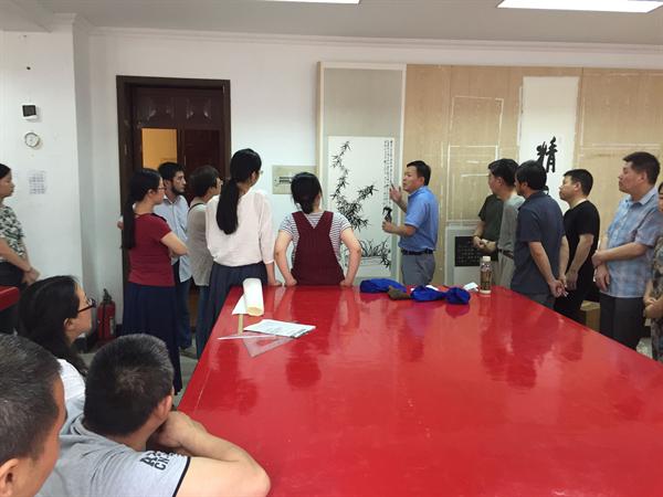 應浙江公共文化管理學院的邀請,6月中國絲綢博物館技術部主任、中國紡織品鑒定保護中心副主任,復旦大學碩士生導師、研究館員汪自強前來浙藝為2016年中國非物質文化遺產(chǎn)傳承人群培訓班的學員開設為期5天的書畫裝裱課程。每次上現(xiàn)場課,學員們會將示范操作用的工作臺圍得滿滿當當,想要近距離學習觀摩汪老師的授課過程。時而用刀裁剪,時而上墻揭裱,汪老師以其嫻熟利落、悠然自得的一系列專業(yè)操作引來身旁學員們的嘖嘖驚嘆。
