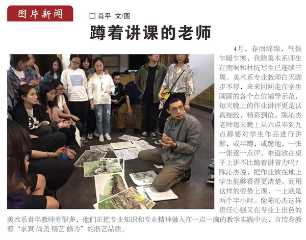 肖平笑言當(dāng)時拍攝的初衷很簡單,一方面是為了給系里存檔用,另一方面也想讓學(xué)校老師們了解美術(shù)系師生在外采風(fēng)寫生的一些情況。令她意想不到的是,照片發(fā)至學(xué)校干部和教師溝通交流的平臺“浙藝宣傳”微信群后,即引來了校領(lǐng)導(dǎo)和老師們的稱贊,大家都為照片中那個蹲著為學(xué)生講解的陳沁杰老師所感動,校報及時邀約肖平為照片配寫了簡短文字,發(fā)表在2017年4月30日第6期《浙江藝術(shù)職業(yè)學(xué)院報》二版。