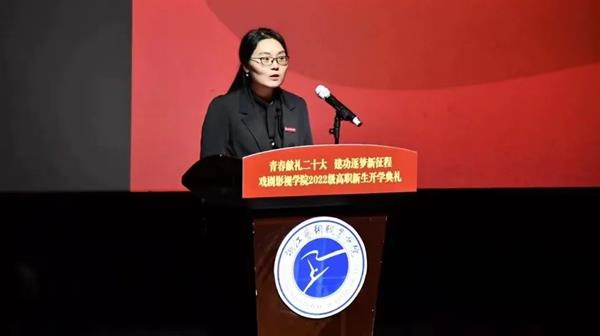 中國大學(xué)生自強之星、校學(xué)生會執(zhí)行主席、2020級影視編導(dǎo)專業(yè)陳雪蓮作為在校生代表發(fā)言。她分享自己在戲影的成長故事,鼓勵學(xué)弟學(xué)妹們“學(xué)在戲影,堅定理想信念,勇毅前行”、“愛在戲影,奮力拼搏,常懷感恩之心”、“夢在戲影,敢于突破,勇于嘗試”。