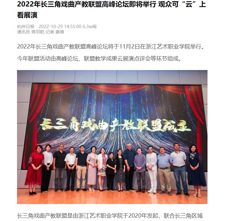 杭州日?qǐng)?bào):2022年長(zhǎng)三角戲曲產(chǎn)教聯(lián)盟高峰論壇即將舉行 觀眾可“云”上看展演