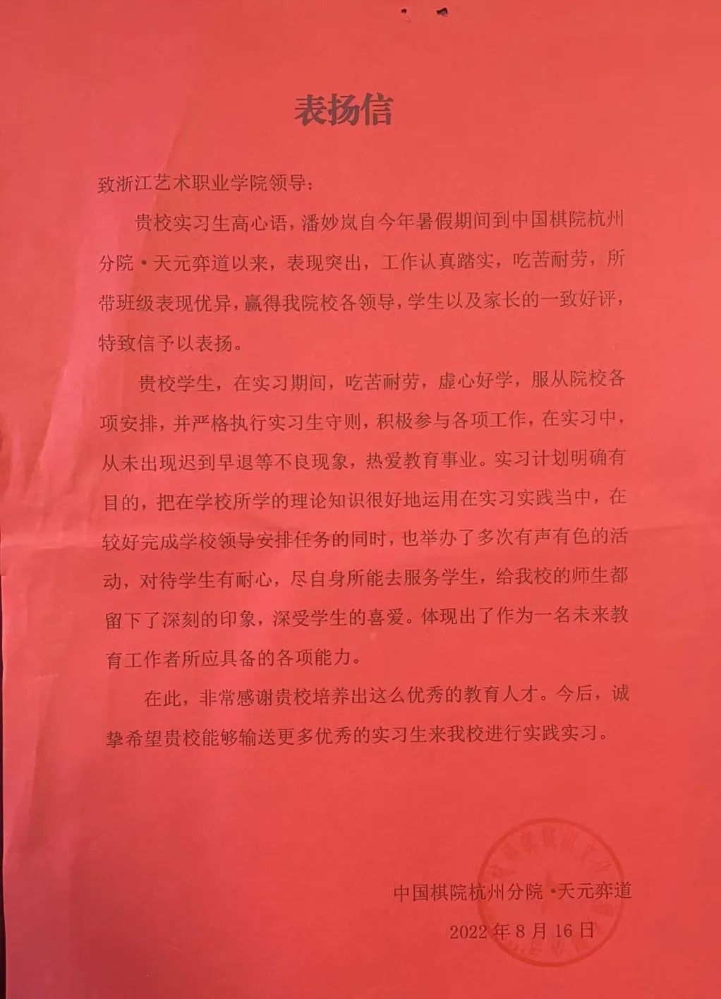 天元奕道·中國棋院杭州分院作為國內(nèi)權(quán)威的棋類培訓(xùn)機(jī)構(gòu),在近年的國內(nèi)外各類比賽中取得了驕人的成績,奪得了2009年全國圍棋甲級(jí)聯(lián)賽冠軍,為杭州、為國家培養(yǎng)輸送了大量棋類人才,為杭州的棋文化品質(zhì)生活作出了貢獻(xiàn)。2022年暑期夏令營,學(xué)前教育學(xué)生前往棋院見習(xí),棋院表示我院學(xué)子認(rèn)真負(fù)責(zé)、熱情耐心的品質(zhì)與突出的專業(yè)水平正是他們所需要的當(dāng)代大學(xué)生人才。