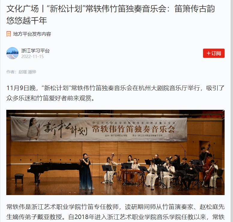 學習強國浙江平臺:文化廣場丨“新松計劃”常軼偉竹笛獨奏音樂會:笛簫傳古韻 悠悠越千年