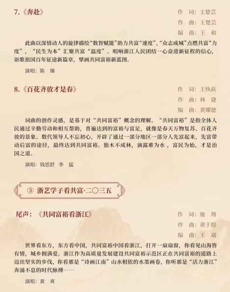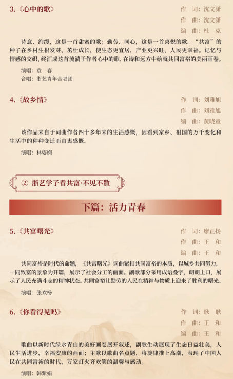 作為2021年度浙江文化藝術(shù)發(fā)展基金資助項目,這臺音樂會以浙江推進(jìn)共同富裕的實踐過程為脈絡(luò),在全校范圍內(nèi)廣泛征稿,組織音樂學(xué)院作曲理論教研室、聲樂教研室、流行音樂教研室等部門創(chuàng)作了一批反映浙江人民推進(jìn)共同富裕進(jìn)程的優(yōu)秀原創(chuàng)歌曲,以獨唱、重唱、合唱等演唱形式展現(xiàn)浙江在高質(zhì)量發(fā)展建設(shè)共同富裕示范區(qū)進(jìn)程中涌現(xiàn)出的動人故事,唱響“共同富裕看浙江”的時代強音,學(xué)習(xí)貫徹黨的二十大精神。