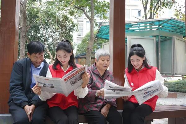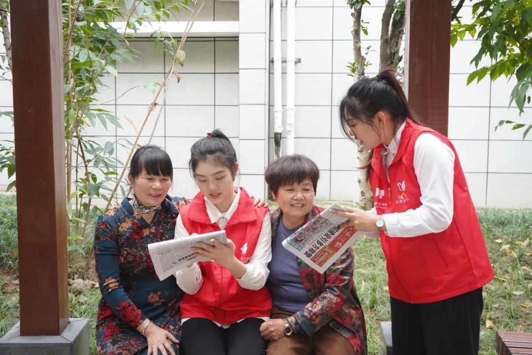 同學們和居民們圍坐在一起,通過報紙領(lǐng)讀,逐字逐句帶領(lǐng)居民學習黨的二十大報告精髓,與居民們結(jié)合報告中的關(guān)鍵與核心,談體會,話未來,暢想未來美好生活。