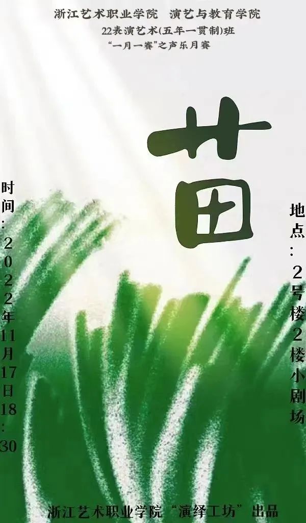 青春正在進行,我們風(fēng)華正茂。近日,演教學(xué)院2022級表演藝術(shù)(五年一貫制)班在二號樓小劇場舉行首次聲樂月賽《苗》。