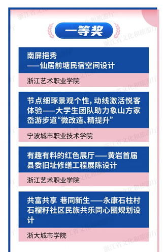 本次大賽是深入貫徹浙江省旅游業(yè)“微改造、精提升”五年行動(dòng)計(jì)劃的生動(dòng)實(shí)踐,讓高校師生成為助力浙江旅游業(yè)高質(zhì)量發(fā)展的新生力量,助力實(shí)現(xiàn)“席地而坐,悅心而游”。自今年6月大賽啟動(dòng)以來(lái),共征集到22所高校共81組參賽作品。經(jīng)過角逐,首屆浙江省大學(xué)生助力旅游業(yè)“微改造、精提升”創(chuàng)意策劃大賽最終產(chǎn)生一等獎(jiǎng)4個(gè),二等獎(jiǎng)7個(gè),最佳創(chuàng)意獎(jiǎng)1個(gè),最佳策劃獎(jiǎng)1個(gè),同時(shí)公布了10個(gè)三等獎(jiǎng)、10個(gè)優(yōu)秀獎(jiǎng)和5個(gè)最佳組織獎(jiǎng)名單。