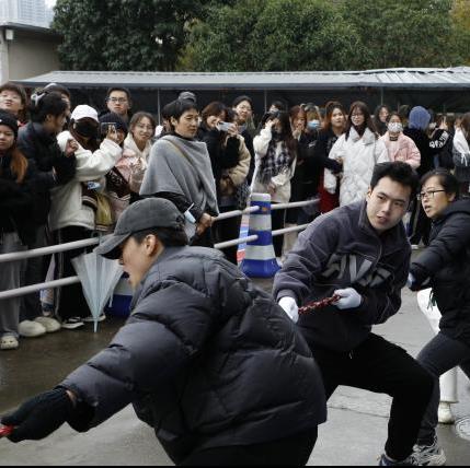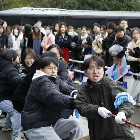 拔河比賽在現(xiàn)場熱烈高漲的氣氛中正式開始,七支隊伍按抽簽結(jié)果進行角逐。隨著比賽哨聲的響起,場內(nèi)的吶喊聲與加油聲此起彼伏,雙方隊員緊握手中的長繩,彎腰扎步,卯足勁齊心協(xié)力往后拔。場邊的老師和同學也不遺余力地為場上選手助威鼓勁,在紅繩過線的那一刻興奮歡呼,為獲勝方喝彩,也為落敗方鼓掌叫好。