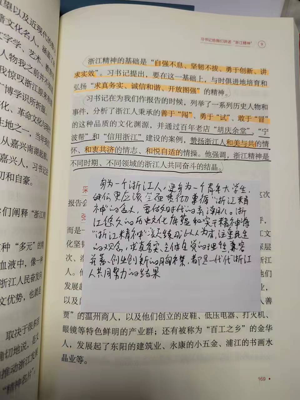比賽開展以來,廣大浙藝青年通過反復(fù)閱讀、仔細(xì)品味、深刻領(lǐng)悟習(xí)近平總書記的重要講話精神,從書中認(rèn)真摘抄精彩語句,記錄學(xué)習(xí)感悟。同學(xué)們的精讀感悟充滿真情實(shí)感:有的立志不負(fù)韶華,努力拼搏,為中華民族偉大復(fù)興奮發(fā)圖強(qiáng);有的立足自身專業(yè)實(shí)際,立志回歸基層,助力家鄉(xiāng)文化建設(shè);還有許多同學(xué)堅(jiān)守初心,以精益求精的工匠精神嚴(yán)格要求自己,堅(jiān)定人生目標(biāo),把握人生航向……一篇篇精讀感悟的字里行間都表達(dá)出浙藝青年學(xué)子對習(xí)近平總書記殷切囑托的誠摯回應(yīng)。