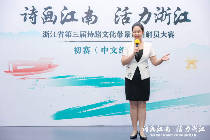 初賽當(dāng)天,在完成線上知識(shí)答題考核后,選手們圍繞“我心中的‘詩畫江南 活力浙江’”主題進(jìn)行現(xiàn)場講解,限時(shí)2分鐘。日前,在浙江省第十五次黨代會(huì)報(bào)告中,“詩畫江南、活力浙江”這一省域品牌主題詞正式官宣。聚焦這一主題,讓選手們更深切地感受到,景區(qū)講解員要緊扣時(shí)代脈搏——不僅僅是“千言萬語”和“千山萬水”,也需要“千變?nèi)f化”和“千絲萬縷”。