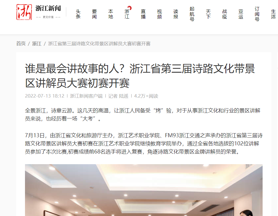 7月13日,由浙江省文化和旅游廳主辦,浙江藝術(shù)職業(yè)學(xué)院、FM93浙江交通之聲承辦的浙江省第三屆詩路文化帶景區(qū)講解員大賽初賽在浙江藝術(shù)職業(yè)學(xué)院繼續(xù)教育學(xué)院舉辦,通過全省各地選拔的102位講解員參加了本次比賽,初賽成績前68名選手將進(jìn)入復(fù)賽,角逐詩路文化帶景區(qū)金牌講解員的榮譽(yù)。