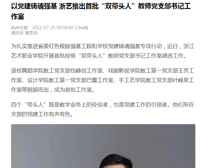 杭州日報:以黨建鑄魂強(qiáng)基 浙藝推出首批“雙帶頭人”教師黨支部書記工作室