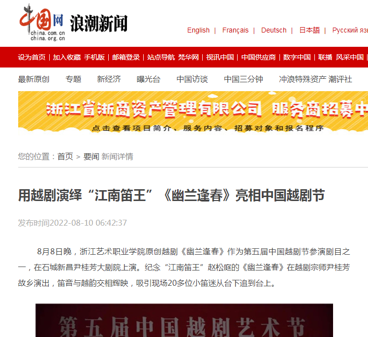 中國網浪潮新聞:用越劇演繹“江南笛王”《幽蘭逢春》亮相中國越劇節(jié)
