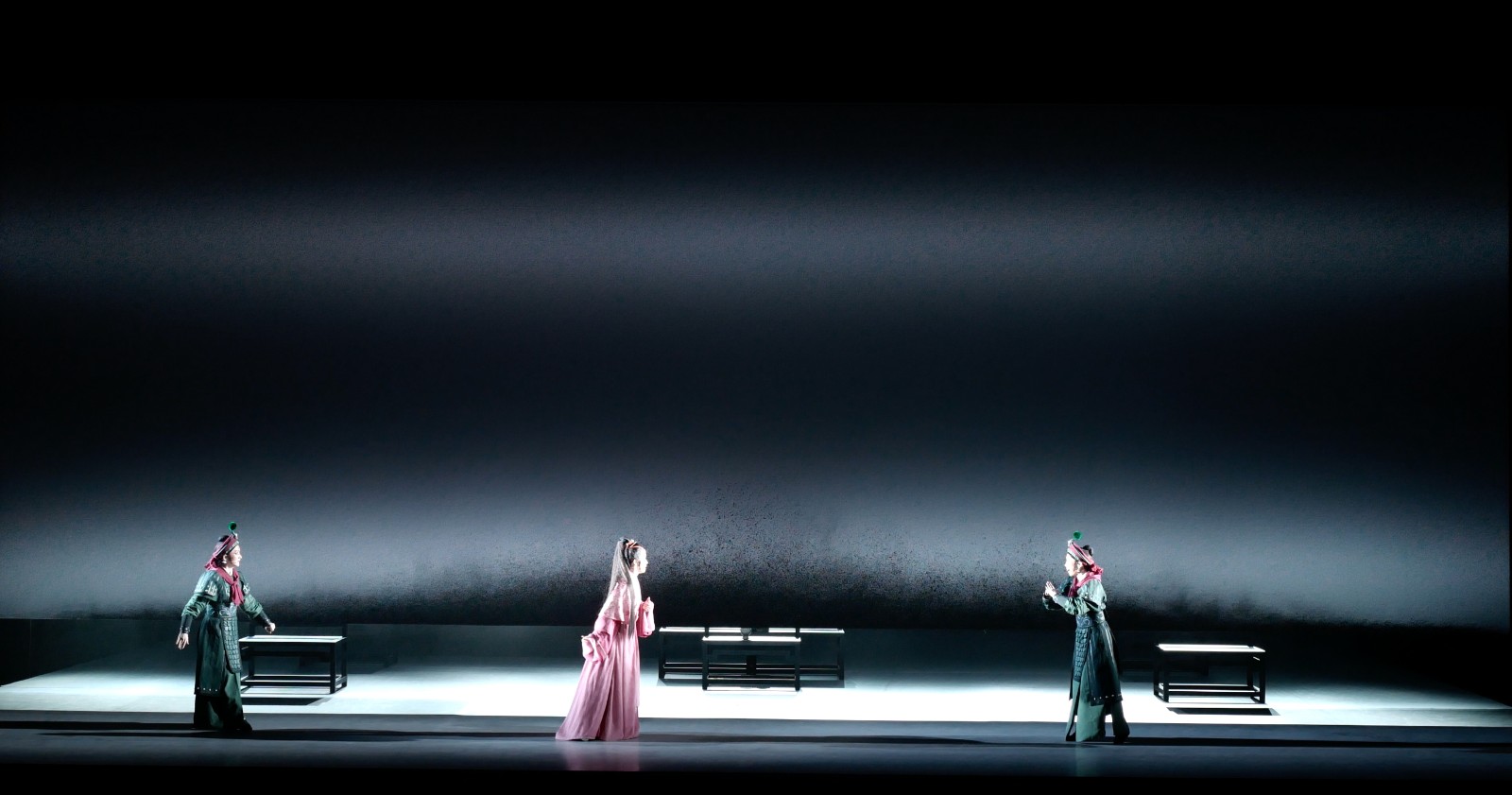 《紅玉》舞臺美術(shù)主體結(jié)構(gòu)是一塊幾乎可以撐滿臺口的15x6米的活動硬景片裝置,沿著底邊繪有濺開的墨線,隨著劇情發(fā)