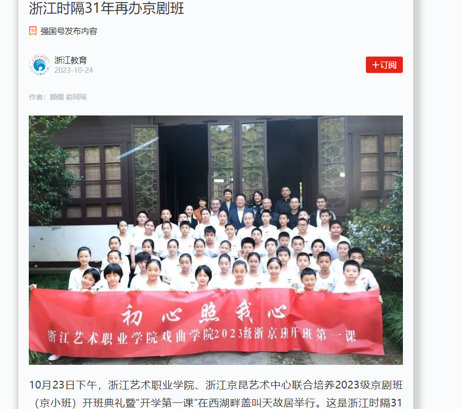 10月23日下午,浙江藝術(shù)職業(yè)學(xué)院、浙江京昆藝術(shù)中心聯(lián)合培養(yǎng)2023級京劇班(京小班)開班典禮暨“開學(xué)第一課”在西湖畔蓋叫天故居舉行。這是浙江時隔31年再度開辦京劇表演藝術(shù)專業(yè)訂單班。