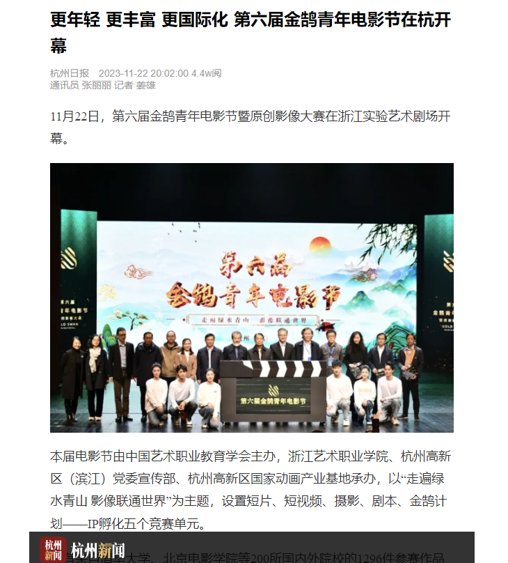 杭州日?qǐng)?bào):更年輕 更豐富 更國際化 第六屆金鵠青年電影節(jié)在杭開幕