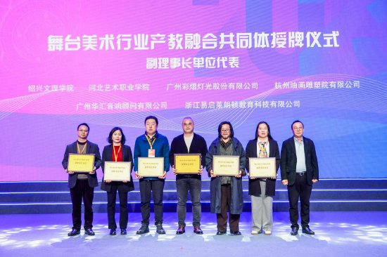 與會領(lǐng)導(dǎo)與嘉賓共同按下啟動鍵,舞臺美術(shù)行業(yè)產(chǎn)教融合共同體正式成立。大會還為共同體理事長單位、副理事長單位代表授牌。