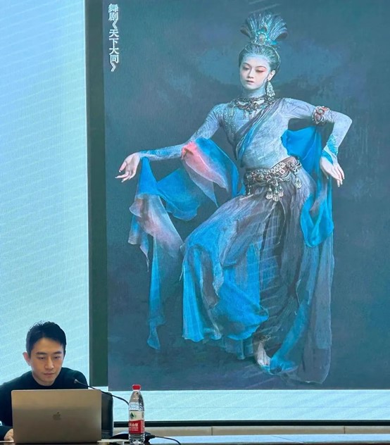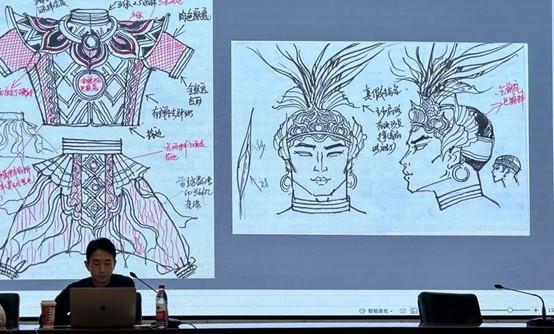 崔曉東介紹了他從事戲劇影視服裝設計行業(yè)多年來的寶貴心得。在案例分析環(huán)節(jié),他向大家分享了舞臺劇《平潭映象》,舞劇《諾瑪阿美》《塵埃落定》等設計作品,分享了大量的設計手稿、幕后創(chuàng)作過程以及最后作品呈現(xiàn)出來的舞臺效果。同時,他結合作品創(chuàng)作歷程,講解了面料再造的具體過程和使用方式,強調了從事戲劇服裝行業(yè)應該掌握的必備專業(yè)基礎課程及其重要性,鼓勵大家多看、多學、多練。