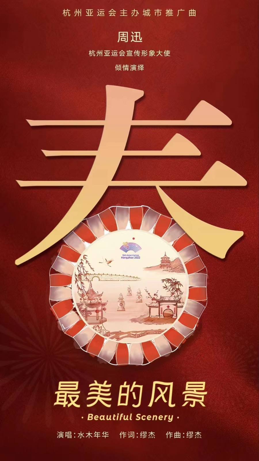 1月15日,由水木年華成員繆杰創(chuàng)作,水木年華演唱,杭州亞運(yùn)會(huì)宣傳形象大使、浙藝校友周迅傾情出演的杭州亞運(yùn)會(huì)主辦城市推廣曲《最美的風(fēng)景》演唱版MV發(fā)布。