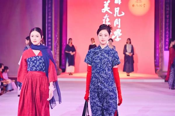 大美非遺,古今傳承。時(shí)尚表演與傳播專(zhuān)業(yè)的同學(xué)們身著曾登上國(guó)際時(shí)裝周的“藍(lán)印花布”走上T臺(tái)。當(dāng)傳統(tǒng)服飾走向國(guó)際舞臺(tái)時(shí),不僅是時(shí)空的碰撞,更是文化的碰撞。同學(xué)們通過(guò)走秀,傳播非遺之美,傳揚(yáng)中國(guó)之美。
