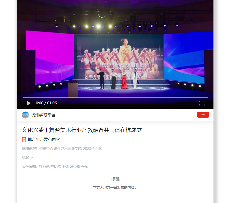 近日,舞臺美術(shù)行業(yè)產(chǎn)教融合共同體成立大會暨中國藝術(shù)職業(yè)教育學(xué)會舞美專委會成立大會在浙江藝術(shù)職業(yè)學(xué)院舉行。