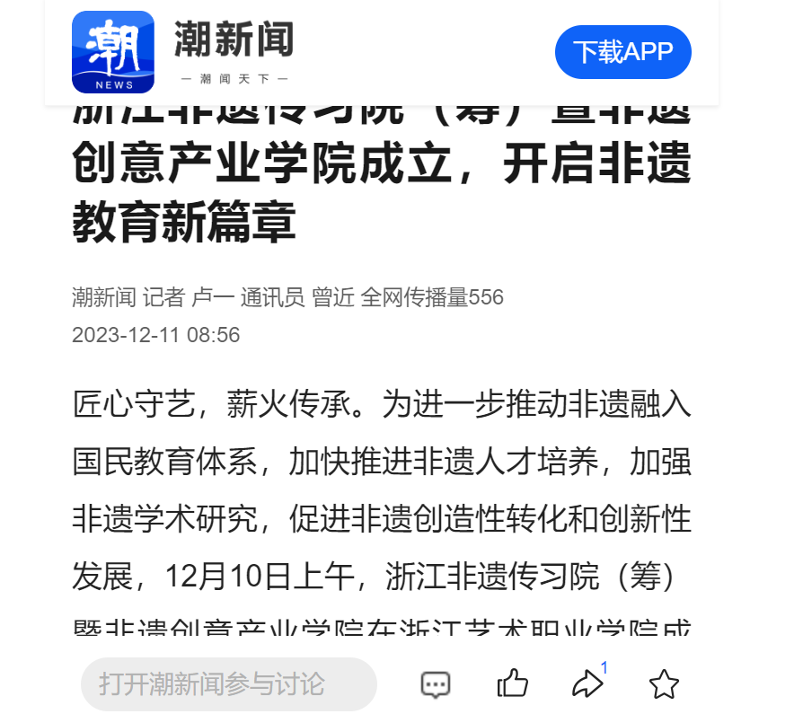 潮新聞:浙江非遺傳習(xí)院(籌)暨非遺創(chuàng)意產(chǎn)業(yè)學(xué)院成立,開(kāi)啟非遺教育新篇章