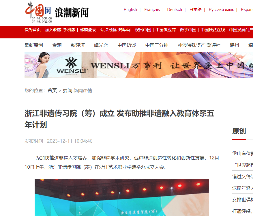 中國網浪潮新聞:浙江非遺傳習院(籌)成立 發(fā)布助推非遺融入教育體系五年計劃