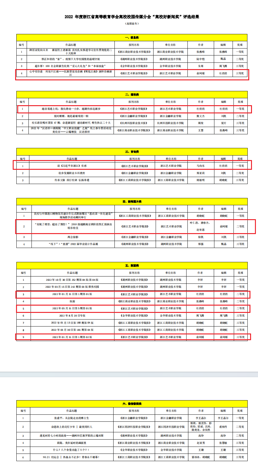 近日,經(jīng)浙江省新聞工作者協(xié)會、浙江省高等教育學會高校校園傳媒分會評審,2022年度浙江省高校好新聞作品評選結(jié)果出爐,評選出消息類、通訊類、言論類、新聞圖片類、版面類、微信微博類一、二、三等獎。我校7個作品獲獎。其中一等獎2項,二等獎3項,三等獎2項,在全省同類院校中獲獎數(shù)量排名第一。