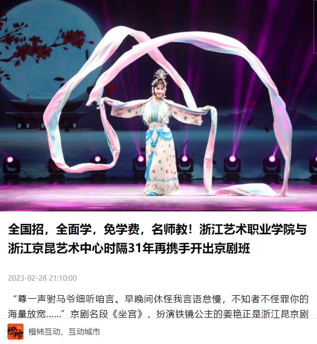 橙柿互動:全國招,全面學(xué),免學(xué)費(fèi),名師教!浙江藝術(shù)職業(yè)學(xué)院與浙江京昆藝術(shù)中心時(shí)隔31年再攜手開出京劇班