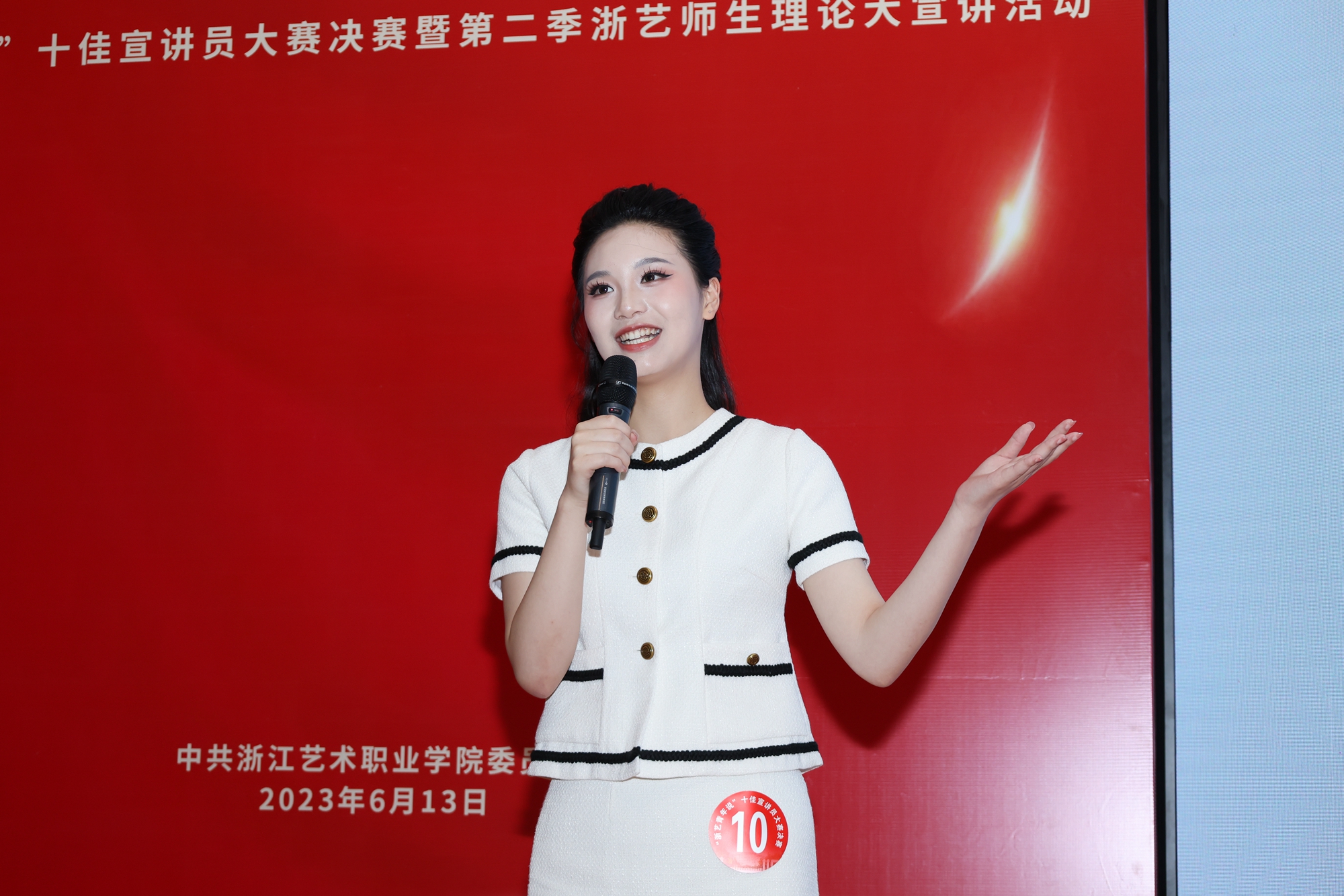 本次宣講員比賽活動是浙江藝術(shù)職業(yè)學(xué)院學(xué)習(xí)貫徹習(xí)近平新時代中國特色社會主義思想主題教育的一項重要活動,通過青年師生主題宣講,引導(dǎo)全校師生深入學(xué)習(xí)貫徹習(xí)近平新時代中國特色社會主義思想和黨的二十大精神,從中汲取進取的智慧和力量,自覺接受思想淬煉和精神洗禮,在不斷強化理論武裝的過程中筑牢信仰之基,補足精神之鈣,把穩(wěn)思想之舵。