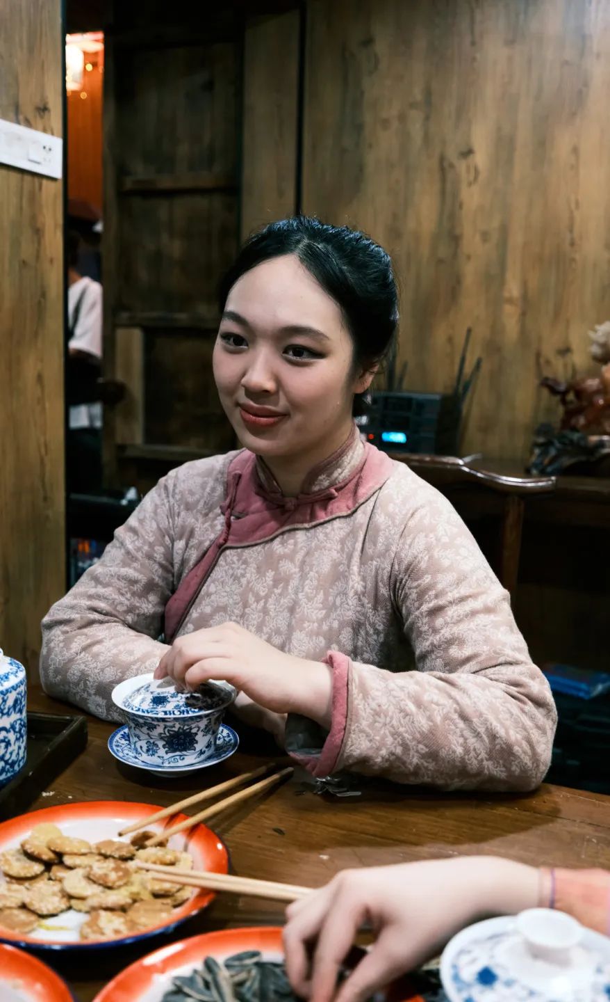 在溫州彩排和演出這兩天,大雨不斷,天氣條件艱苦,同學和老師們沒有任何怨言,依舊堅持在各自的崗位上。演出當天,細雨綿綿,游客們都撐起了雨傘,十分擁擠,同學們冒雨演出,沒有一個人退縮,四個劇組的同學們在各自點位認真演出,他們說看到觀眾為自己停下腳步被自己的表演吸引時,內(nèi)心得到了極大滿足。有不少游客爭搶著與各種各樣的民國人物進行合影,可見同學們刻畫的人物可謂活靈活現(xiàn)。