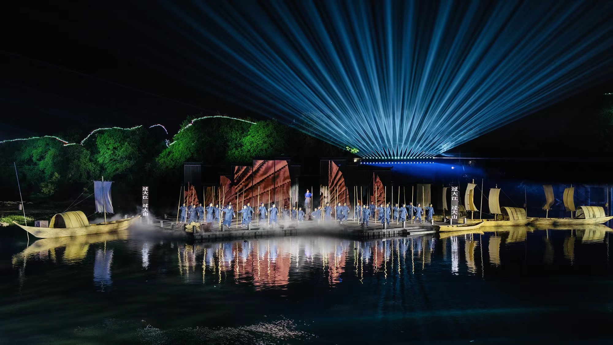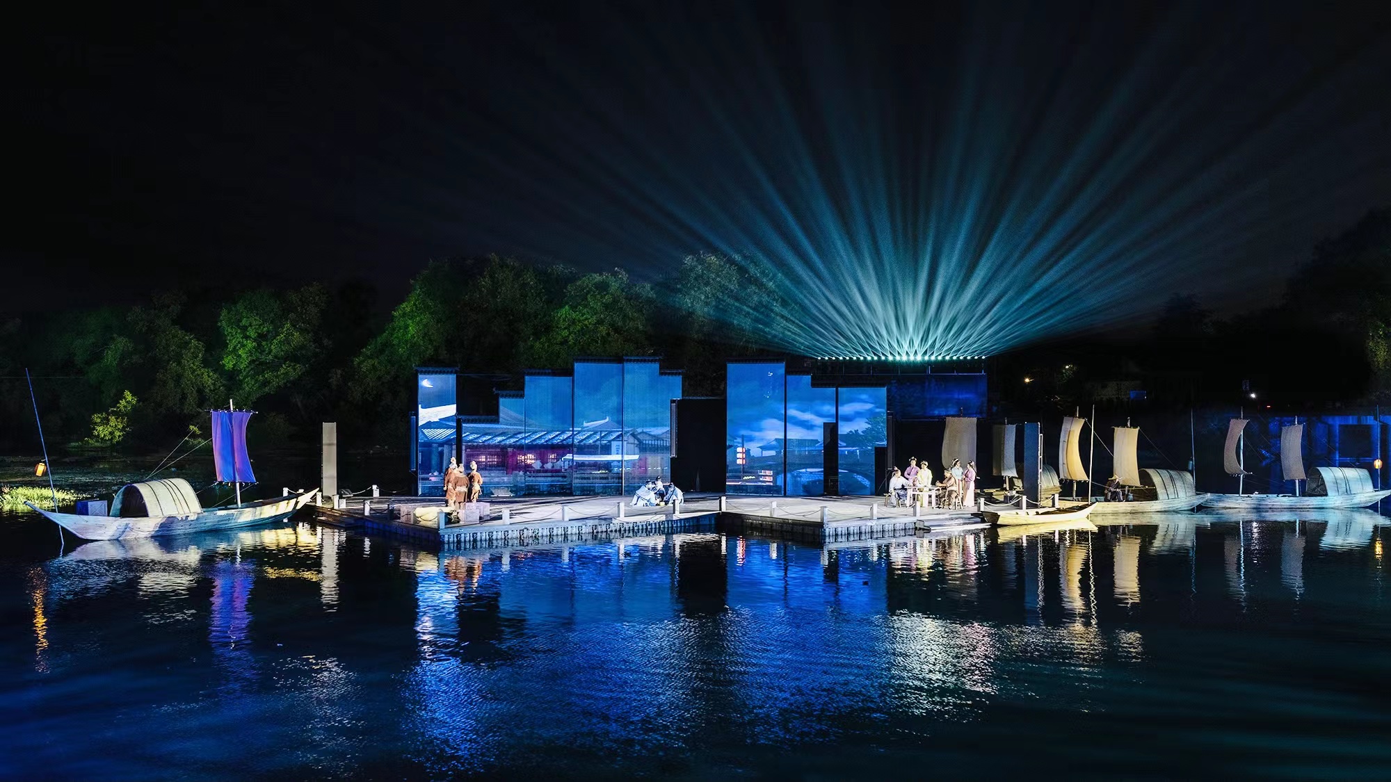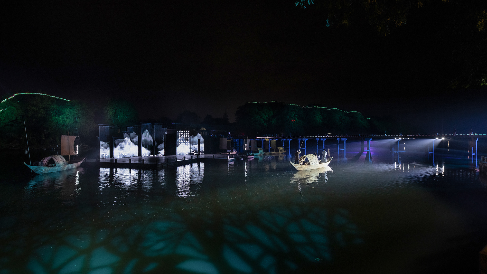 周正平一直對(duì)于藝術(shù)創(chuàng)作有獨(dú)特的見(jiàn)解,被中國(guó)藝術(shù)界譽(yù)為“燈光詩(shī)人”。本次展覽中,周正平的作品有越劇《紅玉》和山水劇場(chǎng)《清溪江湖》。《紅玉》的燈光設(shè)計(jì)融入舞美整體空間的韻律,又作為流動(dòng)的畫(huà)筆自成體系。在白色調(diào)的空靈布景中,使用和諧的色彩和精致的筆觸,描繪出簡(jiǎn)約詩(shī)化的情境。在創(chuàng)造意象空間的表現(xiàn)手法上,運(yùn)用富有張力和節(jié)奏感的光影,既刻畫(huà)了表演動(dòng)作,又強(qiáng)化了全女班演員在武戲上的陽(yáng)剛氣質(zhì)。將繁復(fù)的技術(shù)手段和凝練的藝術(shù)構(gòu)思隱藏在詩(shī)意畫(huà)面背后,通過(guò)光形成視覺(jué)語(yǔ)匯,與觀眾進(jìn)行情緒對(duì)話。在《清溪江湖》中,周正平讓視覺(jué)藝術(shù)進(jìn)入清湖古鎮(zhèn)的整體公共空間,既是對(duì)沉睡著的江山文化的喚醒,也是他游走半生對(duì)故鄉(xiāng)的獻(xiàn)禮。
