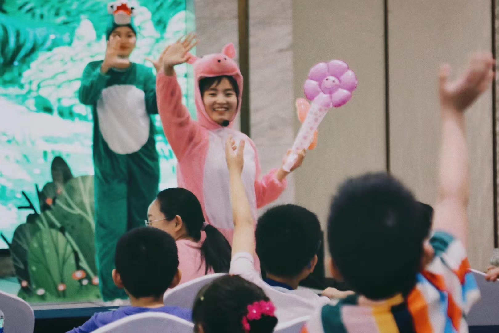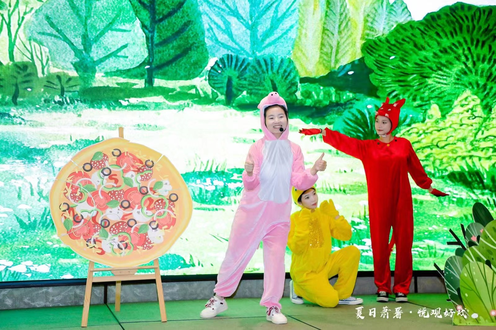 “小豬做了一塊很大的餅,然后累得睡著了。睡醒后,發(fā)現(xiàn)有人偷吃了一口它做的大餅,小朋友們,小豬能找到吃它大餅的人嗎?”浙江藝術(shù)職業(yè)學(xué)院演藝與教育學(xué)院學(xué)前教育專業(yè)學(xué)生正在繪聲繪色地演繹兒童劇《誰(shuí)吃了我的大餅》。這是發(fā)生在杭州開(kāi)元名都大酒店內(nèi)的一幕。