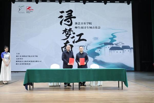 此次音樂(lè)會(huì)是音樂(lè)學(xué)院在積極響應(yīng)《國(guó)家職業(yè)教育實(shí)施改革方案》和學(xué)校高質(zhì)量發(fā)展內(nèi)涵關(guān)于文旅融合、產(chǎn)教融合、校企合作方向上所開(kāi)展的一項(xiàng)具體舉措。此前,經(jīng)過(guò)前期調(diào)研和溝通商議,浙江藝術(shù)職業(yè)學(xué)院音樂(lè)學(xué)院與湖州南潯文旅發(fā)展集團(tuán)有限公司達(dá)成校企合作意向,雙方約定共同對(duì)南潯古鎮(zhèn)的文化內(nèi)涵進(jìn)行深度挖掘,通過(guò)專場(chǎng)音樂(lè)會(huì)、音樂(lè)劇、音樂(lè)節(jié)等形式,探索校企合作的新模式,共同打造符合南潯特色的文化標(biāo)識(shí)。音樂(lè)會(huì)上,吳樟華、陳毅與湖州南潯文旅發(fā)展集團(tuán)有限公司副總經(jīng)理褚夏亮、副總經(jīng)理丁建強(qiáng)分別就“校企合作”和“黨建共建”簽訂合作共建協(xié)議。
