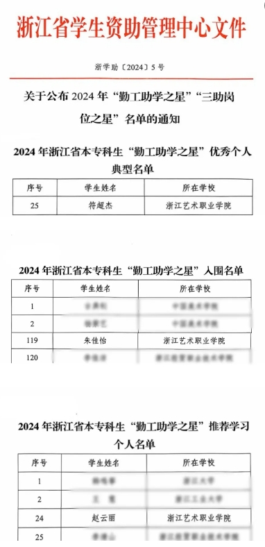 符超杰獲評2024年浙江省本專科生“勤工助學之星”優(yōu)秀個人典型,趙麗云獲評2024年浙江省本專科生“勤工助學之星”推薦學習個人,朱佳怡榮獲2024年浙江省本專科生“勤工助學之星”入圍。