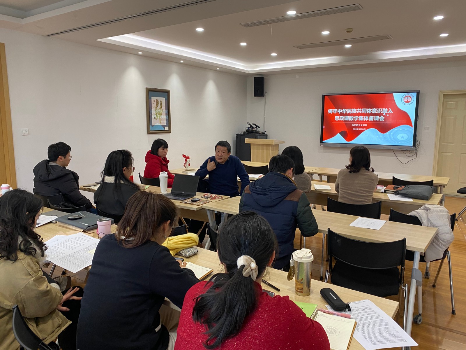 為貫徹落實習近平總書記關(guān)于加強和改進民族工作的重要思想,將鑄牢中華民族共同體意識融入思政課教學,促進新時代思政課改革創(chuàng)新,不斷深化青年學生對中華民族共同體歷史必然性的認識,12月25日,馬克思主義學院在圖信研討室召開鑄牢中華民族共同體意識融入思政課教學的集體備課會。校黨委委員、宣傳部部長、統(tǒng)戰(zhàn)部部長傅文鋼,演藝與教育學院教師蔣曼曼以及馬院全體教師參加會議。