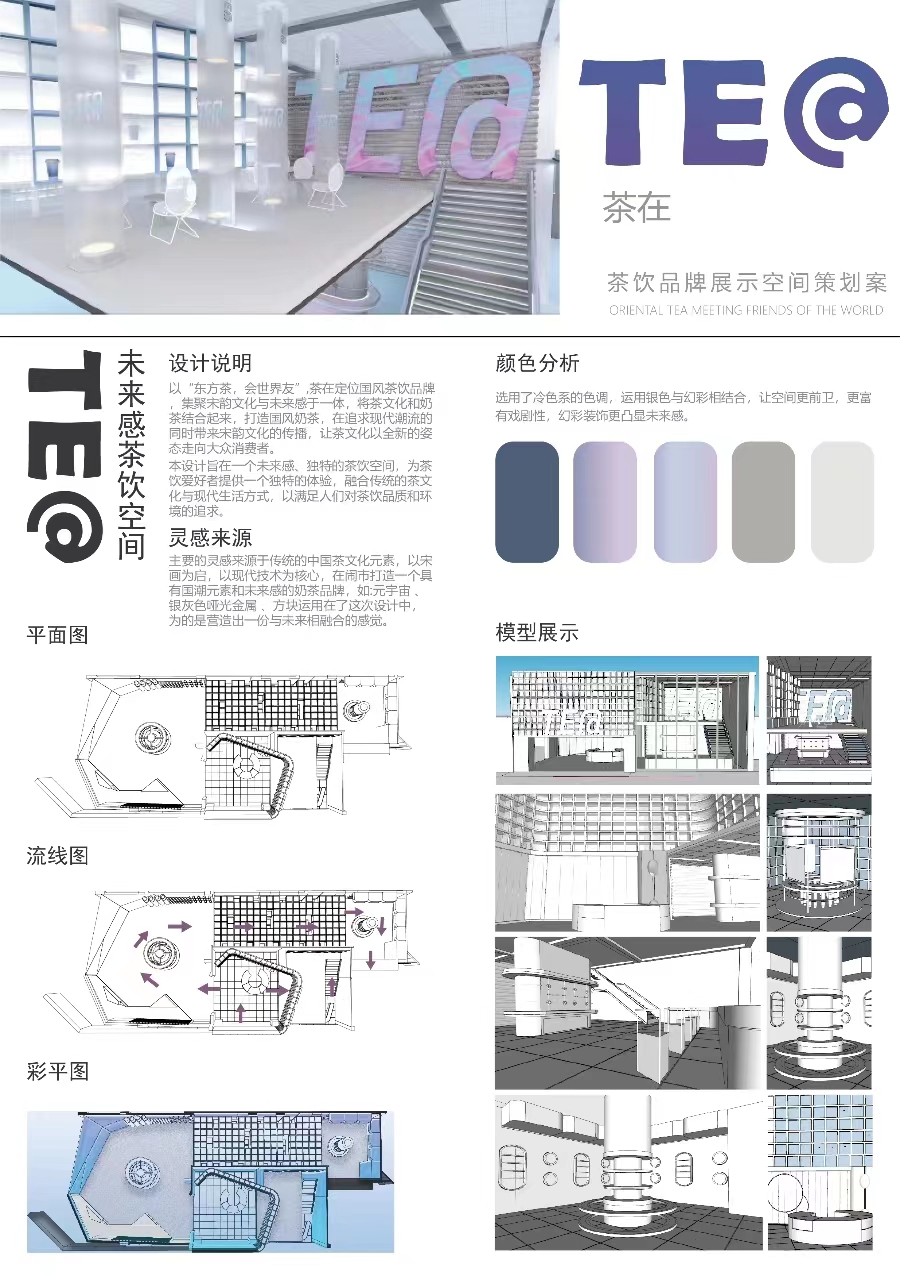 作品名稱:《TE@茶在》——茶飲品牌展示空間策劃案,作者:尹佳瑤、李佳、沈瀟瀟,班級:21展示藝術(shù)設(shè)計,指導(dǎo)教師:查方興。