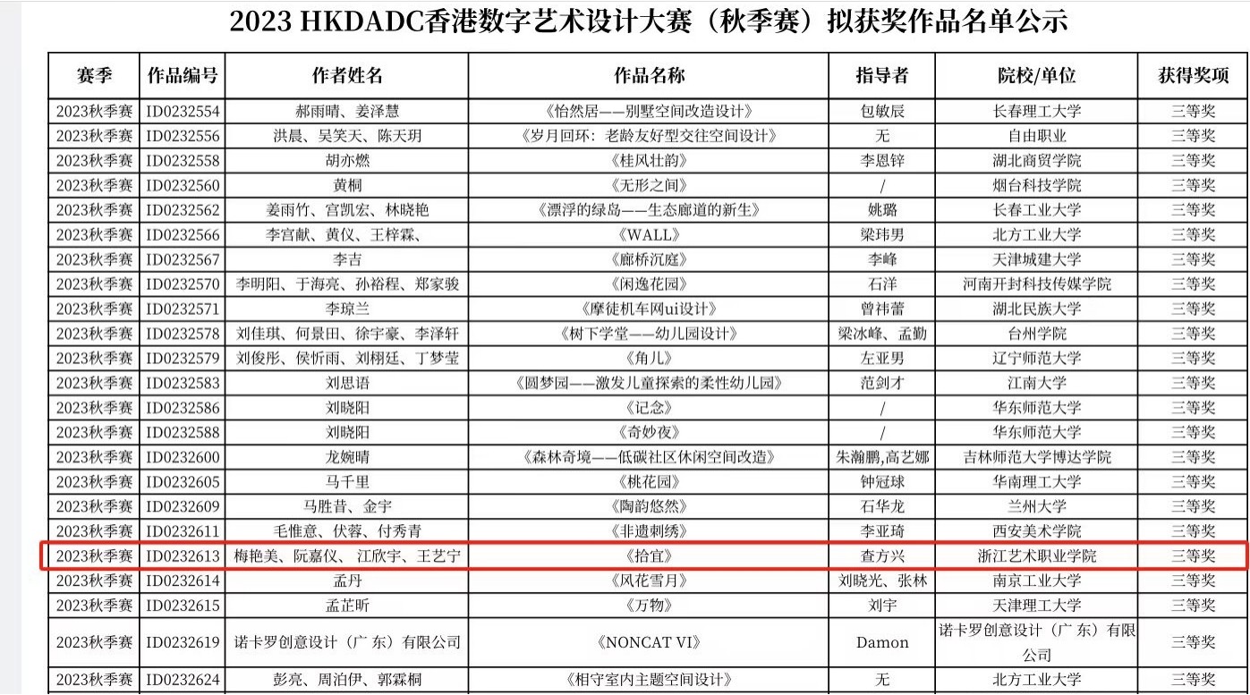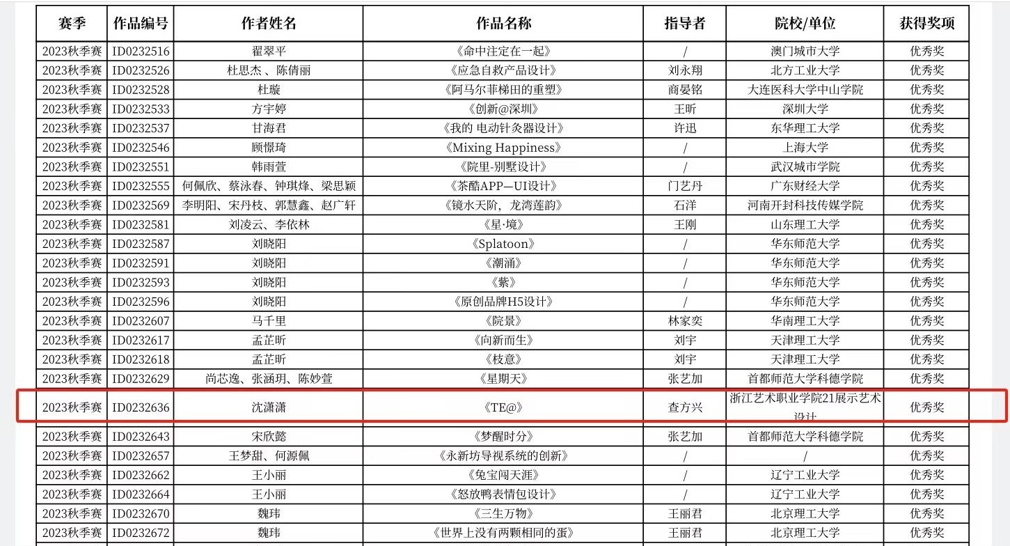 兩組作品也在近期公布的2023 HKDADC香港數(shù)字藝術(shù)設(shè)計大賽(秋季賽)中榮獲佳績,《拾宜》榮獲三等獎,《TE@》榮獲優(yōu)秀獎。香港數(shù)字藝術(shù)設(shè)計大賽由香港藝術(shù)發(fā)展基金會指導(dǎo)、香港藝術(shù)發(fā)展學(xué)會主辦,秉承“設(shè)計改善生活”的理念,堅持藝術(shù)與技術(shù)并舉,賽事立足香港面向全國(含澳門和臺灣)在校生和數(shù)字藝術(shù)從業(yè)者開放征稿,意在通過賽事挖掘優(yōu)秀設(shè)計師與優(yōu)秀作品,為人類美好生活添磚加瓦。