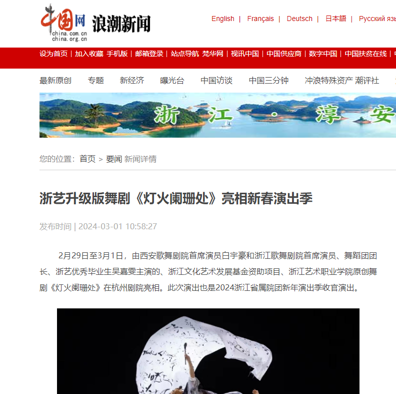 中國網(wǎng)浪潮新聞:浙藝升級(jí)版舞劇《燈火闌珊處》亮相新春演出季