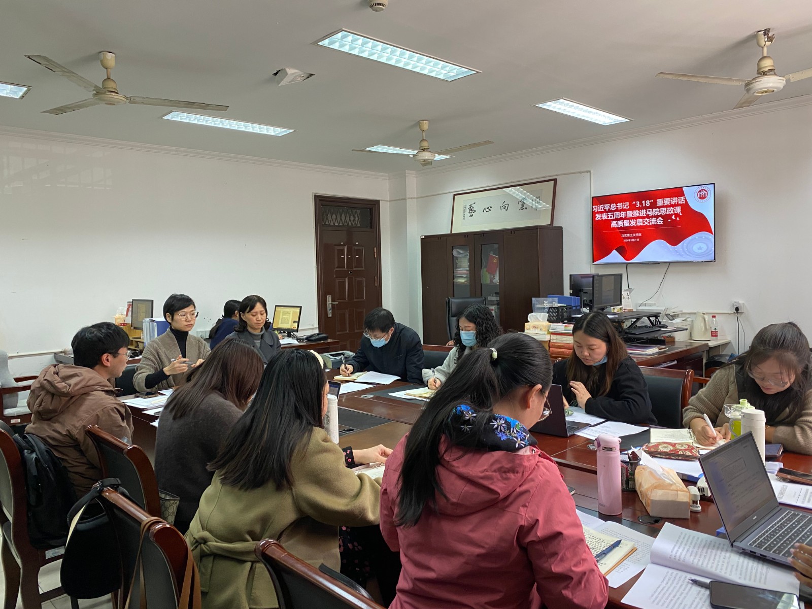黨的十八大以來(lái),以習(xí)近平同志為核心的黨中央高度重視學(xué)校思政課建設(shè)。2019年3月18日,習(xí)近平總書記親自主持召開(kāi)學(xué)校思想政治理論課教師座談會(huì)并發(fā)表重要講話。為系統(tǒng)總結(jié)我校思政課建設(shè)的成果和經(jīng)驗(yàn),深入推進(jìn)新時(shí)代思政課高質(zhì)量發(fā)展,3月21日,馬克思主義學(xué)院召開(kāi)習(xí)近平總書記“3.18”重要講話發(fā)表五周年暨推進(jìn)馬院思政課高質(zhì)量發(fā)展交流會(huì),馬院全體教職工參加會(huì)議。