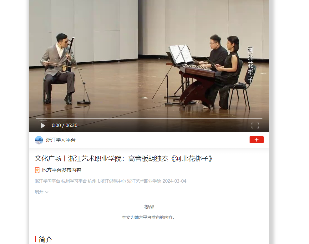學(xué)習(xí)強(qiáng)國浙江平臺:文化廣場丨浙江藝術(shù)職業(yè)學(xué)院:高音板胡獨(dú)奏《河北花梆子》