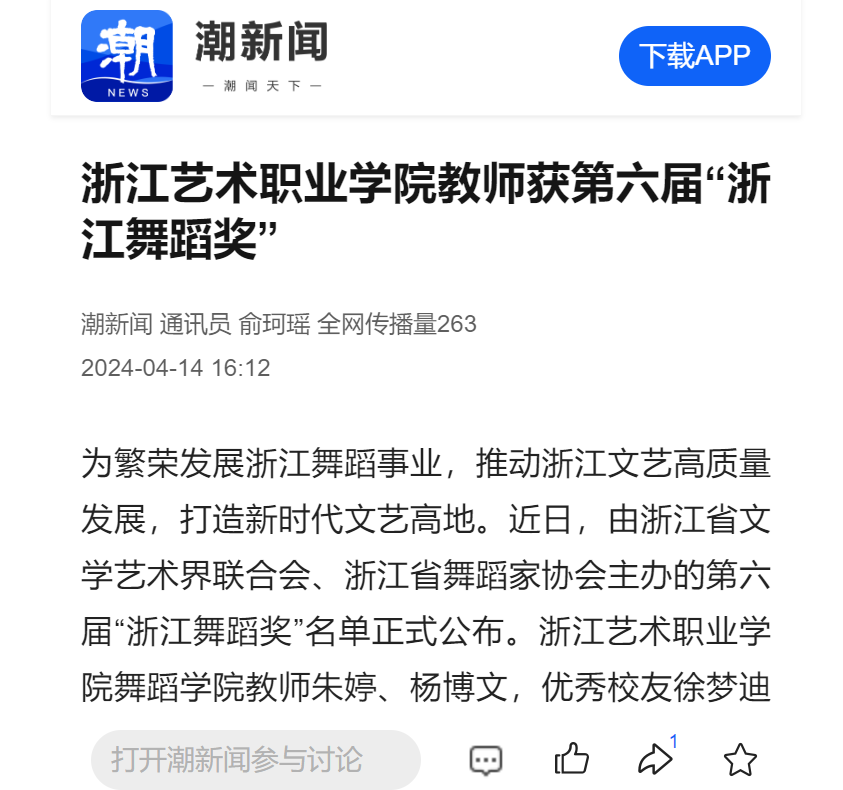 潮新聞:浙江藝術(shù)職業(yè)學(xué)院教師獲第六屆“浙江舞蹈獎(jiǎng)”