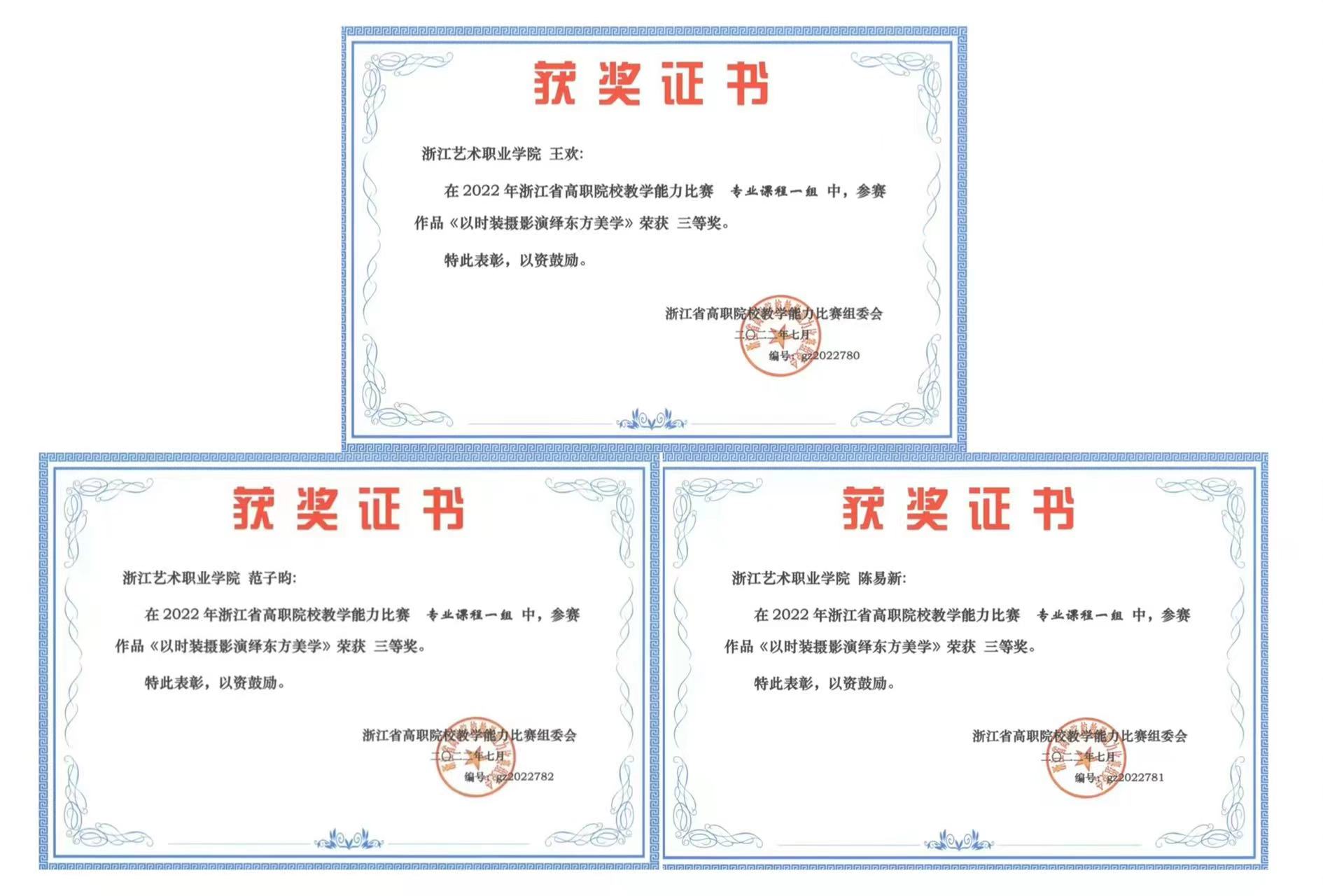 ▲獲2019年、2020年,2022年浙江省高職院校教學能力比賽三等獎