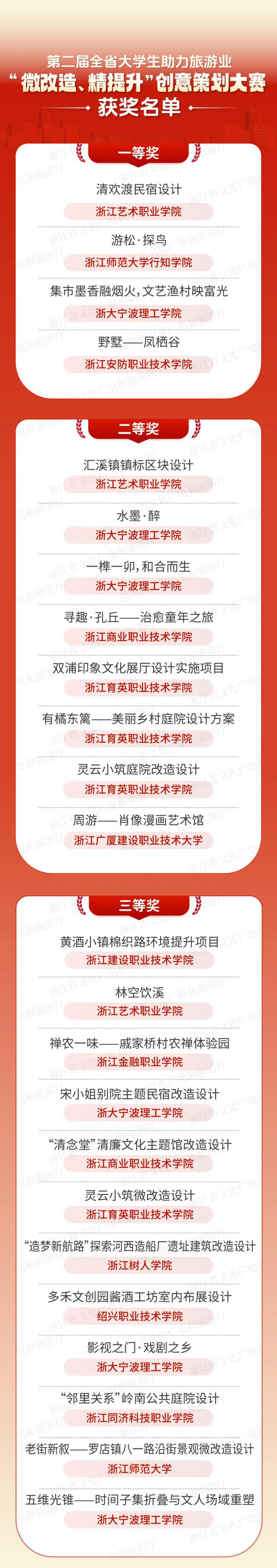 激發(fā)青春無限創(chuàng)意,助力文旅深度融合。4月19日,第二屆浙江省大學生助力旅游業(yè)“微改造、精提升”創(chuàng)意策劃大賽頒獎典禮在浙江藝術職業(yè)學院音樂廳舉行。