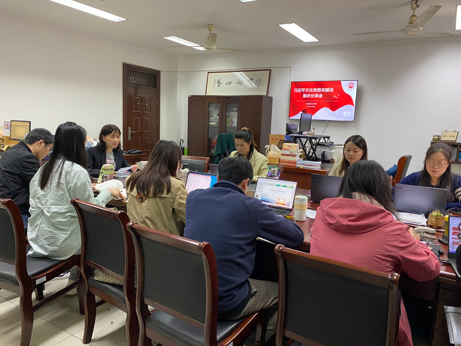 為深刻把握習(xí)近平文化思想的核心要義,持續(xù)加強對習(xí)近平文化思想深刻內(nèi)涵的學(xué)習(xí)、研究、闡釋,挖掘其豐富的思想政治教育資源,結(jié)合《浙江藝術(shù)職業(yè)學(xué)院“習(xí)近平文化思想在浙江實踐與探索”系列研究工作方案》文件要求,4月25日,馬克思主義學(xué)院開展習(xí)近平文化思想關(guān)鍵詞展示分享會,學(xué)院領(lǐng)導(dǎo)班子及全體思政教師參會。