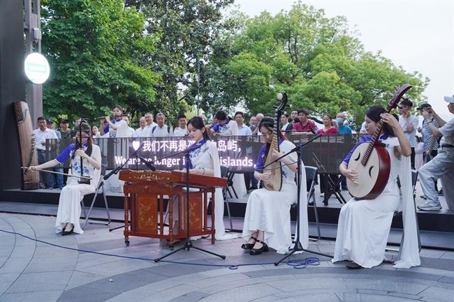 作為全國(guó)文化館服務(wù)宣傳周活動(dòng)主會(huì)場(chǎng)的一大亮點(diǎn),浙藝音樂(lè)學(xué)院“江南女樂(lè)”樂(lè)團(tuán)的專(zhuān)場(chǎng)“文藝賦美”演出在西湖邊精彩上演。樂(lè)團(tuán)的女孩們穿著藍(lán)白相間的禮服,身側(cè)隨風(fēng)飄動(dòng)的紗帶如同西湖的漣漪,隨著優(yōu)美的音樂(lè)進(jìn)入觀眾視野,為大家奉獻(xiàn)了一場(chǎng)絕美浪漫的視聽(tīng)盛宴。