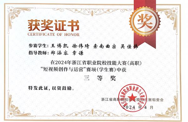 為認(rèn)真落實(shí)習(xí)近平總書記有關(guān)職業(yè)教育的重要論述,全面建設(shè)社會(huì)主義現(xiàn)代化國家、實(shí)現(xiàn)中華民族偉大復(fù)興的中國夢提供有力人才和技能支撐,2024年浙江省職業(yè)院校技能大賽(高職組)暨全國職業(yè)院校技能大賽浙江賽區(qū)選拔賽“短視頻制作與運(yùn)營”賽項(xiàng)于4月2日在湖州職業(yè)技術(shù)學(xué)院開賽。來自全省43所高等職業(yè)院校、2所職業(yè)大學(xué)的88支參賽隊(duì)伍,共351名選手參加了本次競賽。戲劇影視學(xué)院師生團(tuán)隊(duì)榮獲三等獎(jiǎng)。