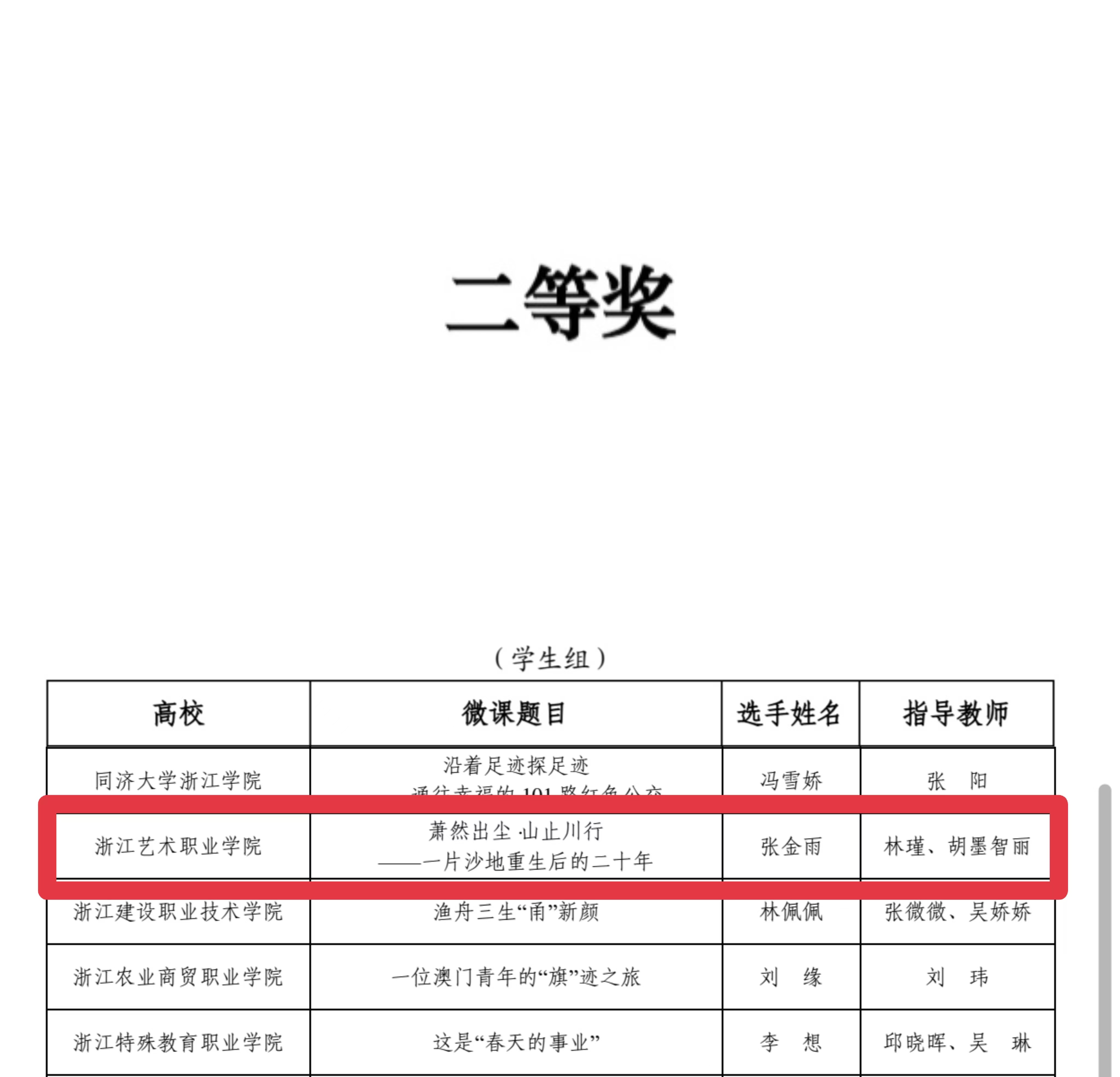 今年3月起,團(tuán)省委、省教育廳、省學(xué)聯(lián)聯(lián)合舉辦了2024年度浙江省高校思政微課大賽。我校推選6位師生的作品參加省賽,其中5件作品從全省107所高校的621件作品中脫穎而出,馬克思主義學(xué)院教師胡芊的微課作品《光影里的家國記憶》、手工藝學(xué)院學(xué)生張金雨的微課作品《蕭然出塵·山止川行 ——一片沙地重生后的二十年 》分別獲得教師組、學(xué)生組二等獎(jiǎng);音樂學(xué)院教師蔣陳竹的微課作品《傳弦樂情 鑄民族魂 》、學(xué)生吳歆怡的微課作品《青年勇?lián)姑?nbsp;譜寫文化新篇》,演藝與教育學(xué)院學(xué)生王楚瑤的微課作品《品味真理之甘 探尋信仰之路》分別獲得教師組、學(xué)生組三等獎(jiǎng)。